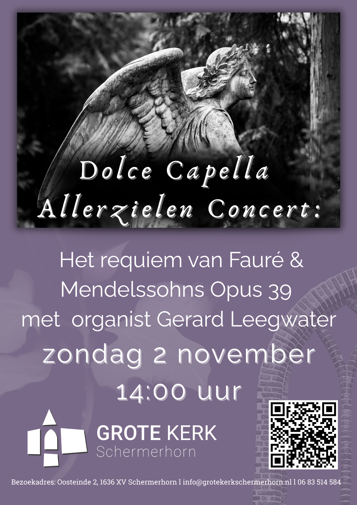 Het vocaal vrouwenensemble Dolce Capella herdenkt met een geheel vrouwelijke uitvoering van het Requiem van Fauré. Het concert vindt plaats op zondag 2 november om 14:00 uur in de Grote Kerk. Het meesterwerk van Fauré is lichter en hoopvoller dan je van een requiem zou verwachten. Fauré schreef het dan ook niet volgens regels en traditie maar recht uit het hart, tickets van nu verkrijgbaar via https://sgk-schermerhorn.weticket.io/allerzielen-concert