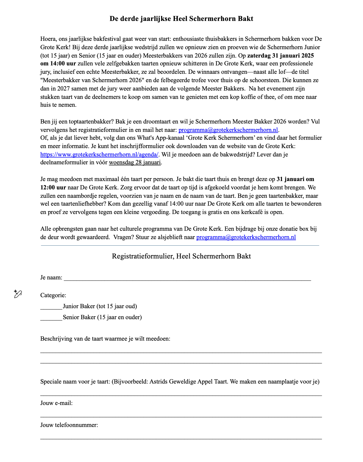 Ben jij een toptaartenbakker? Bak je een droomtaart en wil je Schermerhorn Meester Bakker 2026 worden? Klik HIER om het inschrijfformulier te downloaden, je kunt het formulier invullen en mailen naar programma@grotekerkschermerhorn.nl. Je kunt vanaf nu ook ons Whats App-kanaal ‘Grote Kerk Schermerhorn’ volgen, daar vind je o.a. ook het inschrijfformulier. Lever het formulier in vóór woensdag 28 januari 2026.